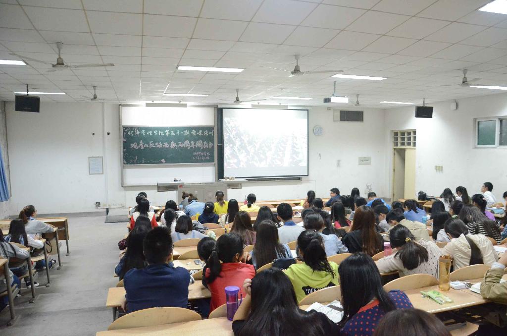 于10月22日晚上七点在教1—102开展了第五十一期党课第一次课外实践活动。全体党课成员与会计学生第一党支部的学生干部一起观看了《纪念反法西斯战争暨抗日战场胜利70周年阅兵》