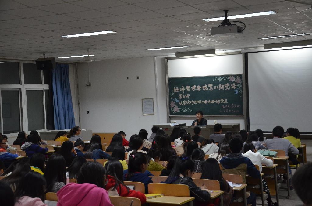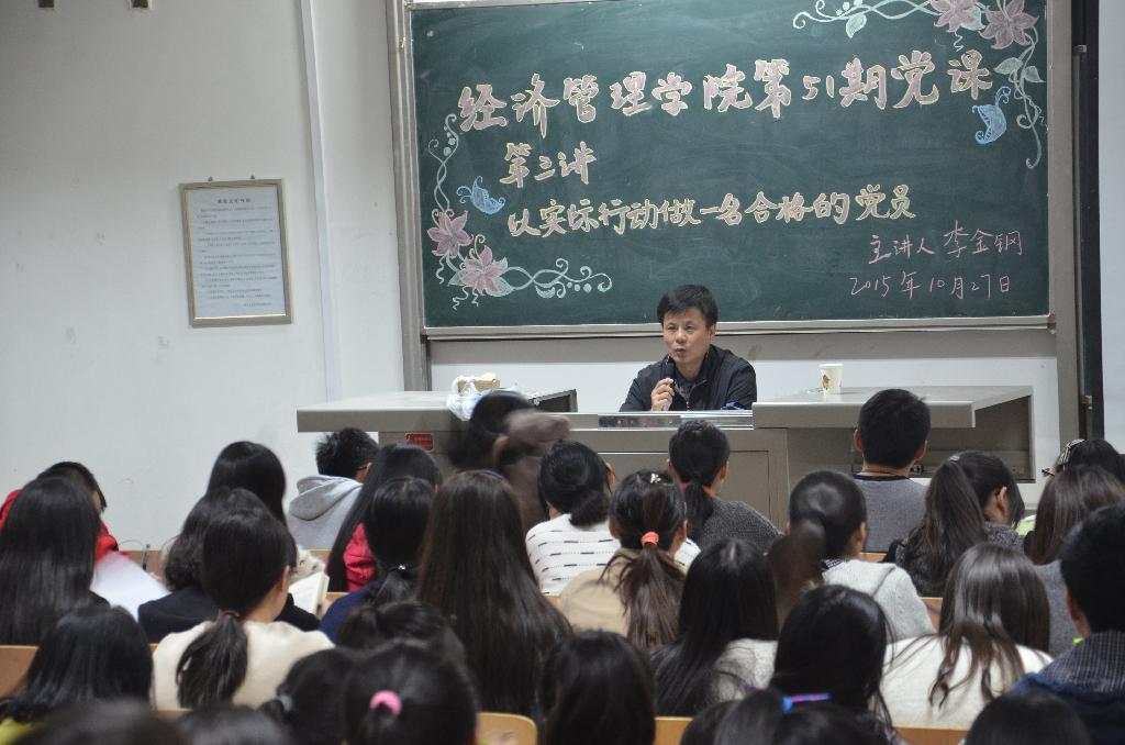 李金钢老师在正式上课前,深情而感慨的回忆了成人导航历史,讲述了成人导航从1955年建校以来学业发展、新校区的建设、女篮的征程等值得称赞的事迹,全体党课成员无不为之动容。随后,李老师从书本为基础出发,为学员们讲解了“以实际行动做一名合格党员”这一部分的内容。首先,李老师要求学员们要树立正确的入党动机,并且结合实际深刻地讲述了入党的真正意义;其次,他提出自觉接受党组织的培养、教育、考察是成长为合格党员的必经之路,大家对此深有同感,并且牢固的树立了了入党的积极态度;再次,李老师强调了认真履行党章上规定的入党手续的重要性;最后,李老师指出只有努力实践“三个代表”重要思想,认真学习党章,对党忠诚、热情,才能做一名新世纪合格的共产党员。李老师的讲解,不仅将 “三个代表”重要思想的精髓传播给了在场的每一位学员,更是让在场的各位同学树立了与党共发展的先进观念。讲课过程中高潮迭起,掌声不断。