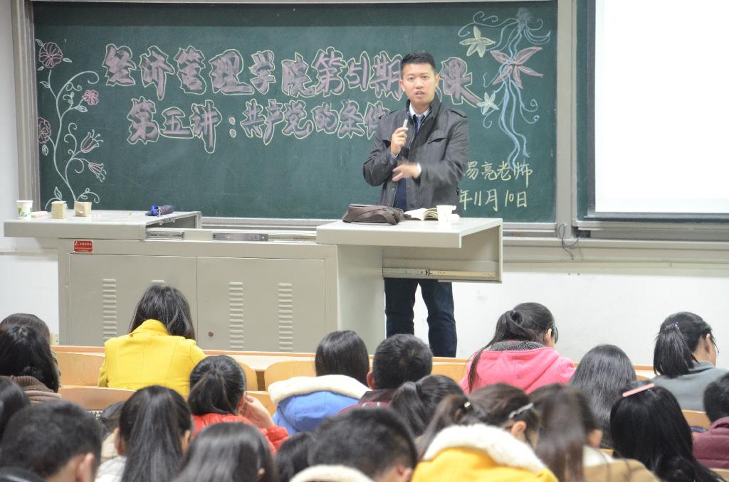 课程开始,易亮老师首先为各个入党积极分子阐述了申请入党的基本条件。包括年龄、家庭成分等方面都做出了详细的阐述。然后,易老师针对学生在入党之前的各方面表现都提出了明确的指导和建议。尤其指出并批评了部分学生在入党前后表现相异的行为,呼吁在座的入党积极分子们要做到入党前后表现一致,要用服务人民的宗旨来严格要求自己。其次,易老师结合自己的生活实际,突出强调了党员在带领群众方面的重要作用,并要求到场的入党积极分子要学会以身作则,要把党的先进性在自己身上体现出来,发挥先进模范作用。同时,易老师还为学习此次党课的入党积极分子列举出了党员的权力与义务,详细解释了部分要点。最后,易老师告诫各个入党积极分子,不忘入党决心,提高能力素质。