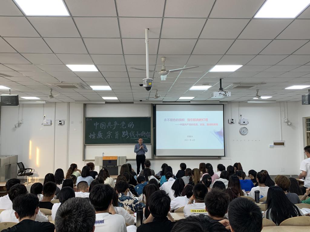 第64期分党校第五讲“中国共产党的性质、宗旨、路线和纲领”在教1-103开展,本次党课由党办校办主任何春水为140余名党课学员进行授课。