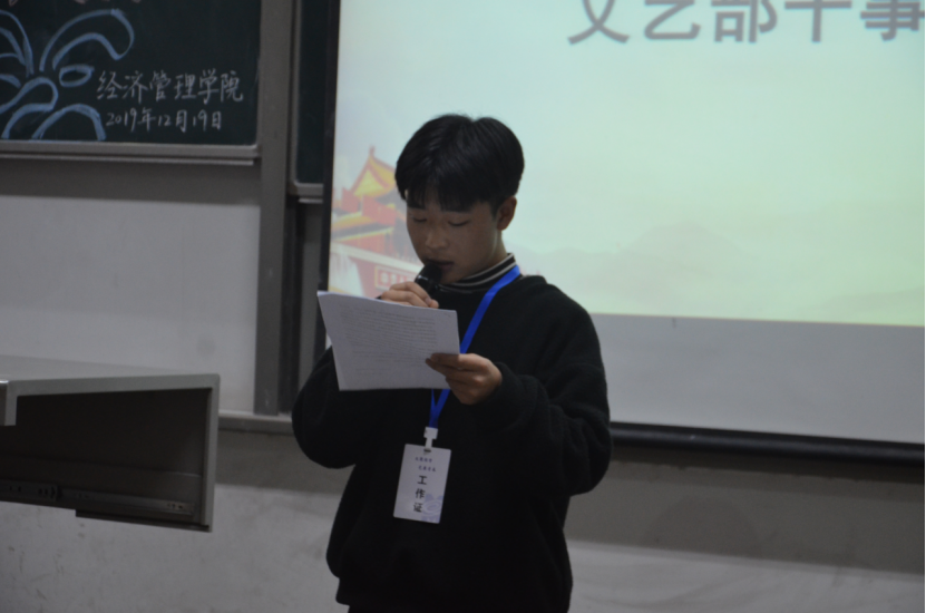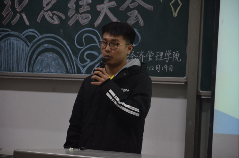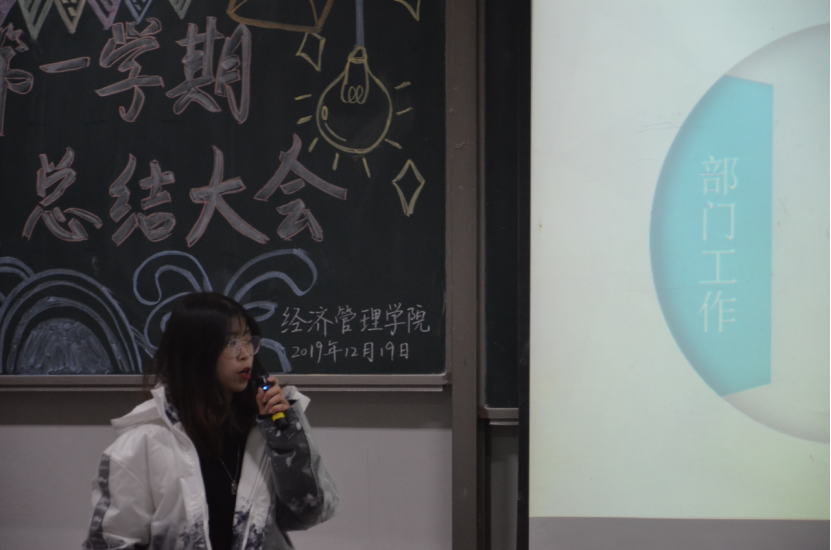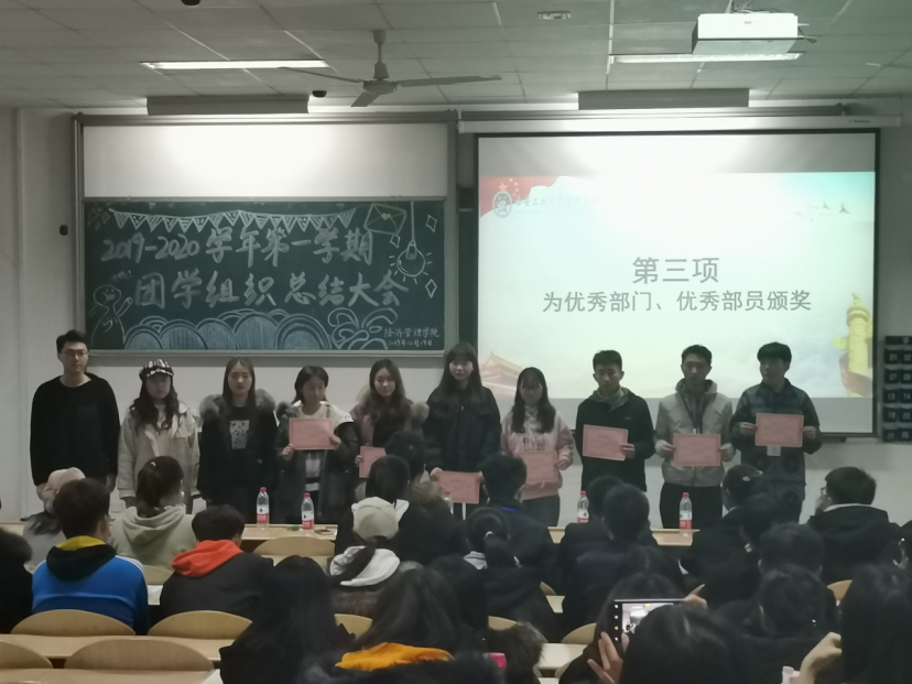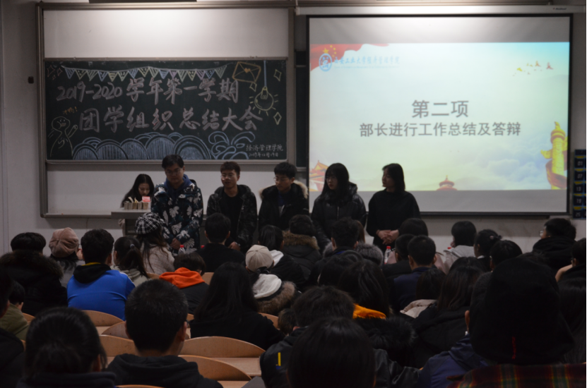大会伊始,团学组织秘书长白宇洁作出讲话,她从活动开展与制度建设两个方面进行总结,肯定了过去一学期各项活动的贯彻实施及队伍建设的稳定发展。同时,她阐明学生干部应具有的“三心二意”之精神:责任心、自信心、包容心及满怀诚意,探寻工作意义。紧接着,团学组织各部门部长依次上台进行工作总结及答辩,回顾本学期的工作亮点,对存在的问题进行反思并提出改进方案,对下学期的工作进行规划,许金鑫老师也就具体问题进行了针对性的指导。随后,许金鑫老师及团学组织主席团为本学期优秀部门、优秀部员颁发荣誉证书并进行合影留念,优秀部员代表文艺部干事吴庆圆的精彩发言也使大会气氛达到高潮。最后,许金鑫老师肯定全体成员的工作成绩,结合具体实际提出看法,号召全体学生干部不忘初心,再接再厉,充分明确自身身份转换,希望大家总结经验与不足,克服现有的困难,更好地迎接下一学期的工作。