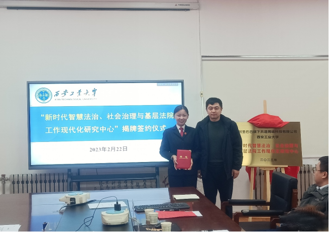 学科发展、专业建设和人才培养情况,刘业轮介绍了公司产业链及未来发展方向,王育晓宣读成立校级“新时代智慧法治、社会治理与基层法院工作现代化研究中心”文件。三方分别就进一步深化了解、相互合作,充分发挥各自优势进行了发言交流。在与会人员的共同见证下,刘业轮副总裁、焦源副院长签订研究中心共建协议。随后,刘业轮副总裁、苏兵院长为“新时代智慧法治、社会治理与基层法院工作现代化研究中心”揭牌。姬浩为未央宫法庭负责人郭丽华颁发研究中心名誉主任聘书。郭丽华为姬浩、王晨昊颁发调解中心聘用证书。