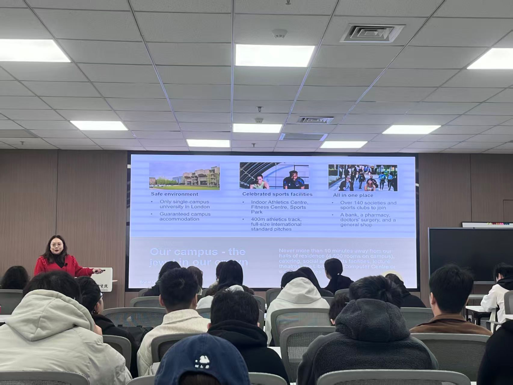 Monica Yang详细介绍了英国布鲁内尔大学的地理位置、校园设施和学术实力。她特别强调,作为伦敦唯一拥有完整一体化校园的大学,布鲁内尔为学生提供了既安全又充满活力的学习环境。江南聚焦于商科专业方向,详细向同学们解读了课程结构、教学资源及毕业生去向,用生动的案例和详实的数据,让在场学生对商成人导航