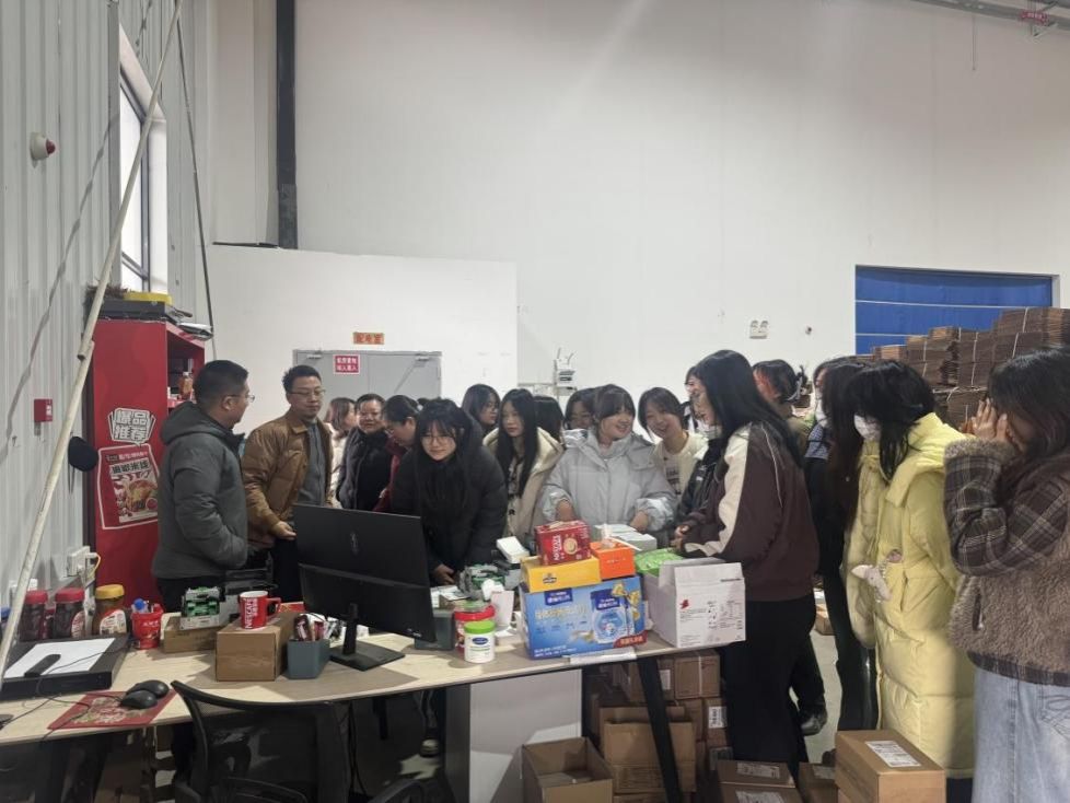 在企业引导下,师生重点参观了仓储区域,了解了维维豆奶、雀巢等产品的存储情况,走访打包区、发货区、退货区等关键区域,观摩了订单处理全流程,学习了仓储管理相关规范。